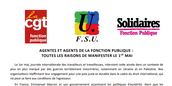 C’est pourquoi, nous appelons les agentes et les agents de la Fonction publique à participer massivement aux manifestations du 1er mai.