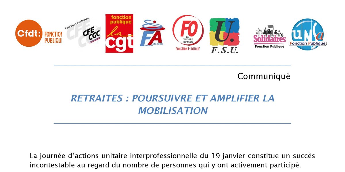 C’est pourquoi, les organisations syndicales de la Fonction publique, CFDT- CGC – CGT – FAFP – FO – FSU – SOLIDAIRES – UNSA, continuent d’exiger que le gouvernement renonce au report de l’âge légal à la retraite de 62 à 64 ans et à l’accélération de l’augmentation de durée de cotisation. Elles s’inscrivent pleinement dans le communiqué interprofessionnel d’hier soir et appellent les salarié.e.s de la Fonction publique à participer activement aux actions et initiatives sur le territoire, y compris par la grève, notamment autour du 23 janvier, jour de la présentation de la loi au Conseil des Ministres, et à la nouvelle journée de grèves et de manifestations le 31 janvier.