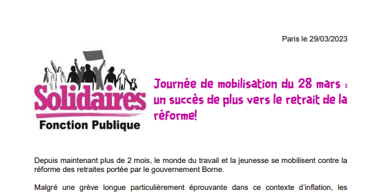 Solidaires Fonction Publique salue et apporte son soutien à tous·tes les collègues agent·es publics qui se mobilisent contre cette réforme injuste, inutile et inefficace.