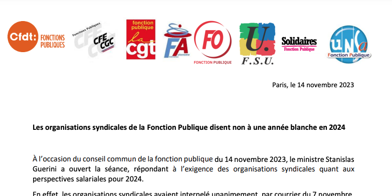 Les organisations syndicales de la Fonction Publique disent non à une année blanche en 2024