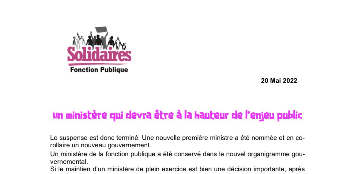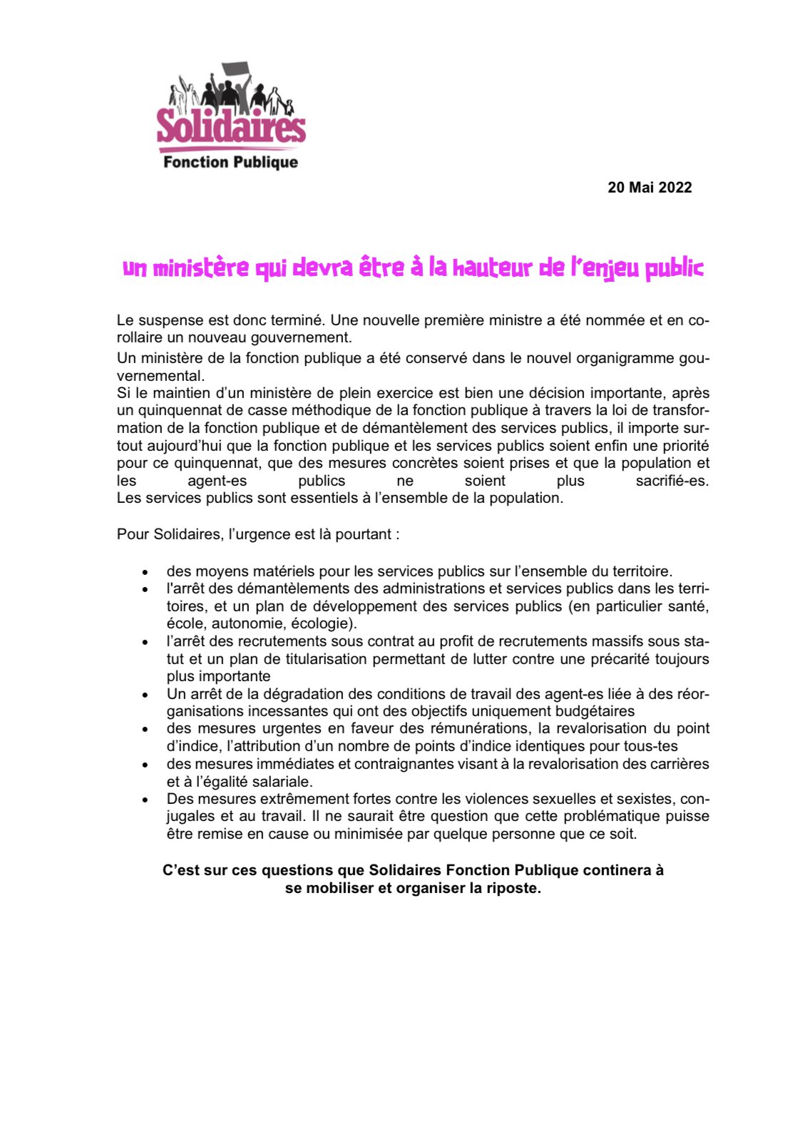Si le maintien d’un ministère de plein exercice est bien une décision importante, après un quinquennat de casse méthodique de la fonction publique à travers la loi de transformation de la fonction publique et de démantèlement des services publics, il importe surtout aujourd’hui que la fonction publique et les services publics soient enfin une priorité pour ce quinquennat, que des mesures concrètes soient prises et que la population et les agent-es publics ne soient plus sacrifié-es.