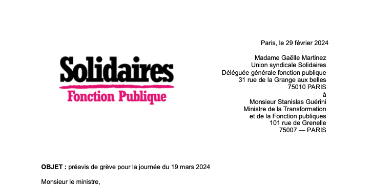 L’Union syndicale Solidaires Fonction publique dépose un préavis de grève allant du lundi 18 mars 2024 19h au mercredi 20 mars 2024 9h.