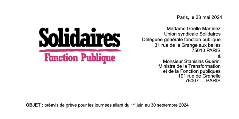 L’Union syndicale Solidaires Fonction publique dépose un préavis de grève pour les journées allant du 1er juin au 30 septembre 2024 (de 0 h à 24 h).