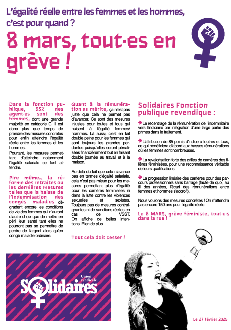 Dans la fonction publique, 63% des agent·es sont des femmes, dont une grande majorité en catégorie C. Il est donc plus que temps de prendre des mesures concrètes pour enfin atteindre l’égalité réelle entre les femmes et les hommes.