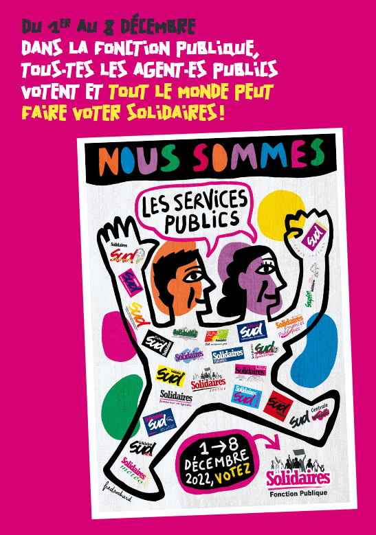 L’Union syndicale Solidaires dans la fonction publique, ce sont 25 organisations SUD et Solidaires, présentes dans la plupart des secteurs. Pour faire avancer le syndicalisme de lutte et vos revendications, le vote SUD et Solidaires doit être massif.
