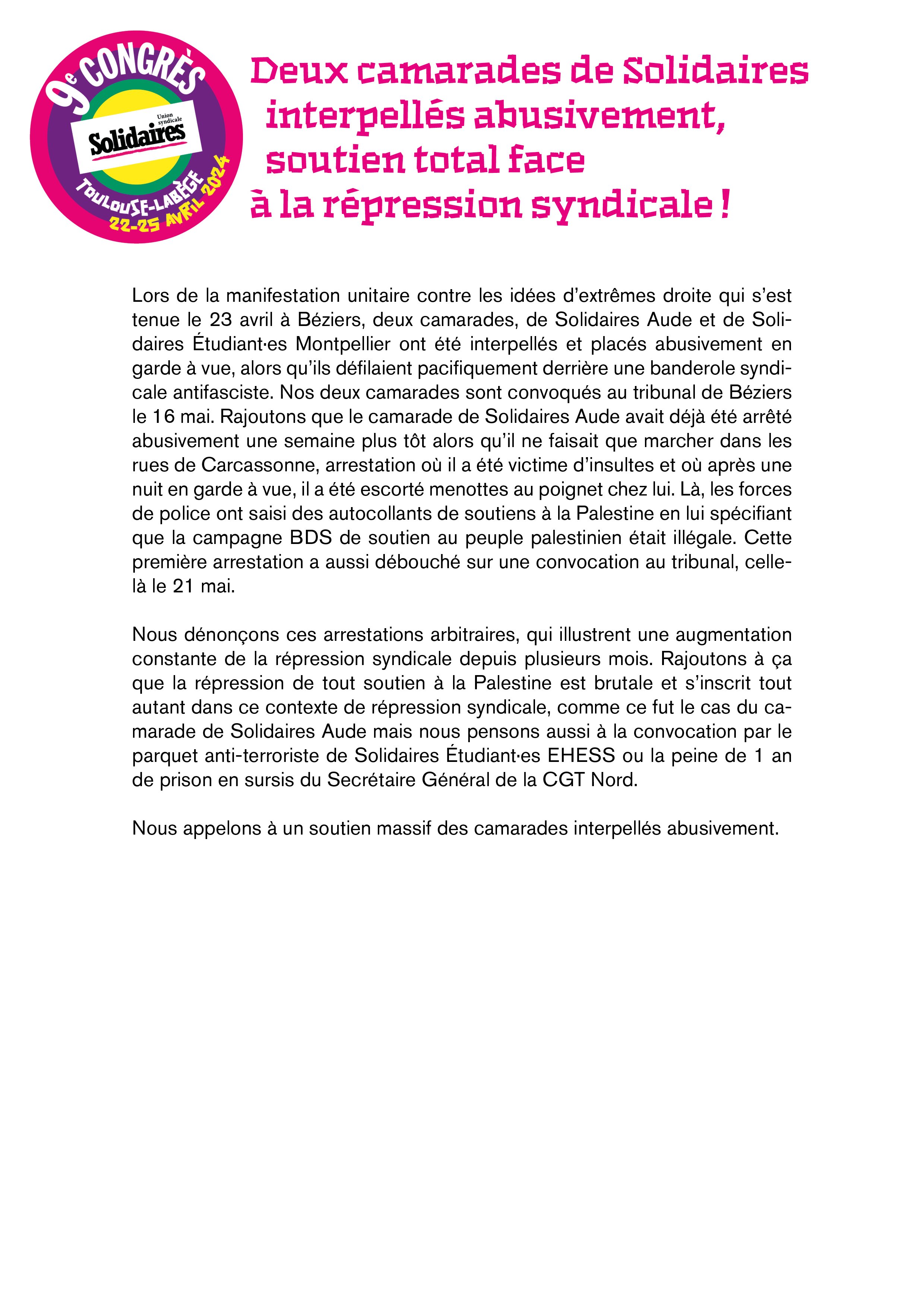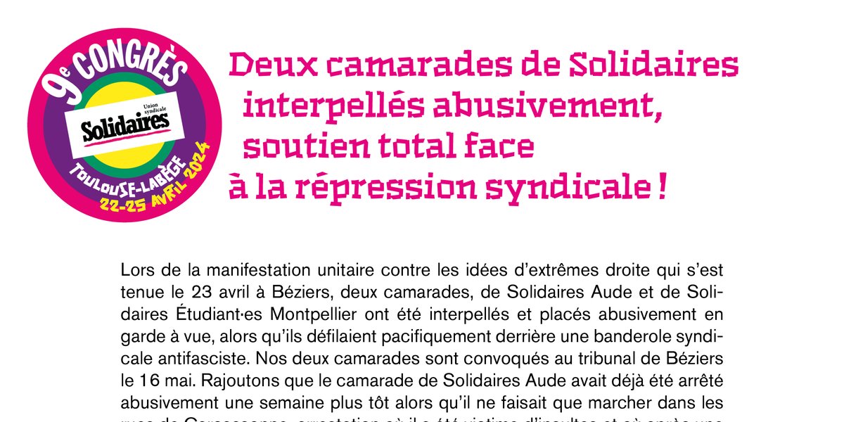 Lors de la manifestation unitaire contre les idées d’extrêmes droite qui s’est tenue le 23 avril à Béziers, deux camarades, de Solidaires Aude et de Solidaires Étudiant·es Montpellier ont été interpellés et placés abusivement en garde à vue, alors qu’ils défilaient pacifiquement derrière une banderole syndicale antifasciste. Nos deux camarades sont convoqués au tribunal de Béziers le 16 mai. Rajoutons que le camarade de Solidaires Aude avait déjà été arrêté abusivement une semaine plus tôt alors qu’il ne faisait que marcher dans les rues de Carcassonne, arrestation où il a été victime d’insultes et où après une nuit en garde à vue, il a été escorté menottes au poignet chez lui. Là, les forces de police ont saisi des autocollants de soutiens à la Palestine en lui spécifiant que la campagne BDS de soutien au peuple palestinien était illégale. Cette première arrestation a aussi débouché sur une convocation au tribunal, celle-là le 21 mai.