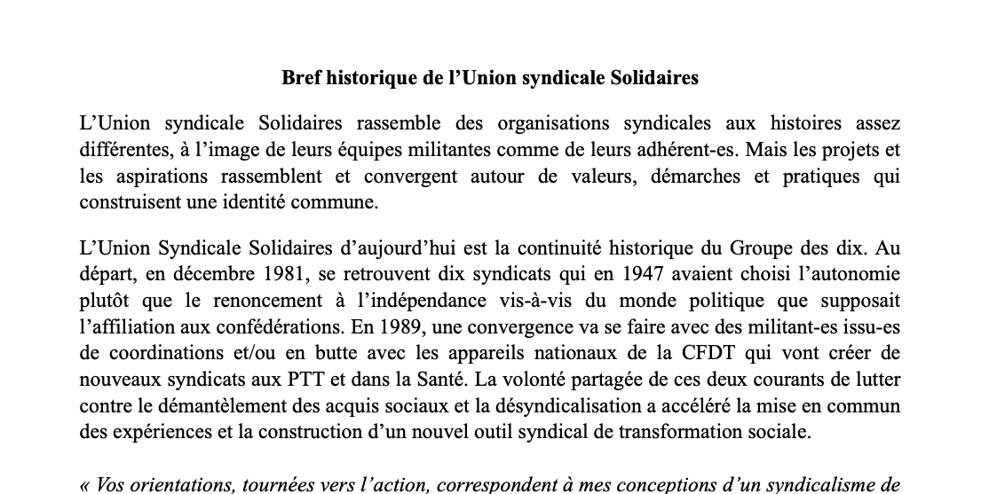 L’Union Syndicale Solidaires d’aujourd’hui est la continuité historique du Groupe des dix. Au départ, en décembre 1981, se retrouvent dix syndicats qui en 1947 avaient choisi l’autonomie plutôt que le renoncement à l’indépendance vis-à-vis du monde politique que supposait l’affiliation aux confédérations. En 1989, une convergence va se faire avec des militant-es issu-es de coordinations et/ou en butte avec les appareils nationaux de la CFDT qui vont créer de nouveaux syndicats aux PTT et dans la Santé. La volonté partagée de ces deux courants de lutter contre le démantèlement des acquis sociaux et la désyndicalisation a accéléré la mise en commun des expériences et la construction d’un nouvel outil syndical de transformation sociale.