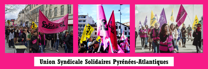 L’Union syndicale Solidaires 64 rassemble les syndicats SUD et Solidaires des Pyrénées-Atlantiques. Elle défend les travailleuses et les travailleurs, quelle que soit leur origine, leur culture, leur genre ou leur statut : du public, du privé, en formation, sans emploi ou à la retraite. Solidaires porte un syndicalisme de lutte pour transformer la société, afin d'en mieux partager les richesses et le temps de travail, afin d’œuvrer à une société plus juste, respectueuse de l'environnement, fondamentalement démocratique, luttant contre l'arbitraire et l'exclusion économique et sociale. Pour une société émancipée des rapports économiques et politiques de domination, œuvrant pour l'intérêt général et satisfaisant tous les besoins collectifs au service de toutes et tous. Solidaires est indépendant des patrons, de l'Etat et des organisations politiques.