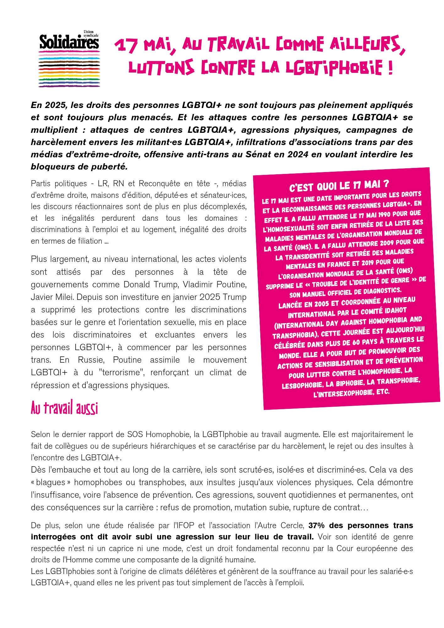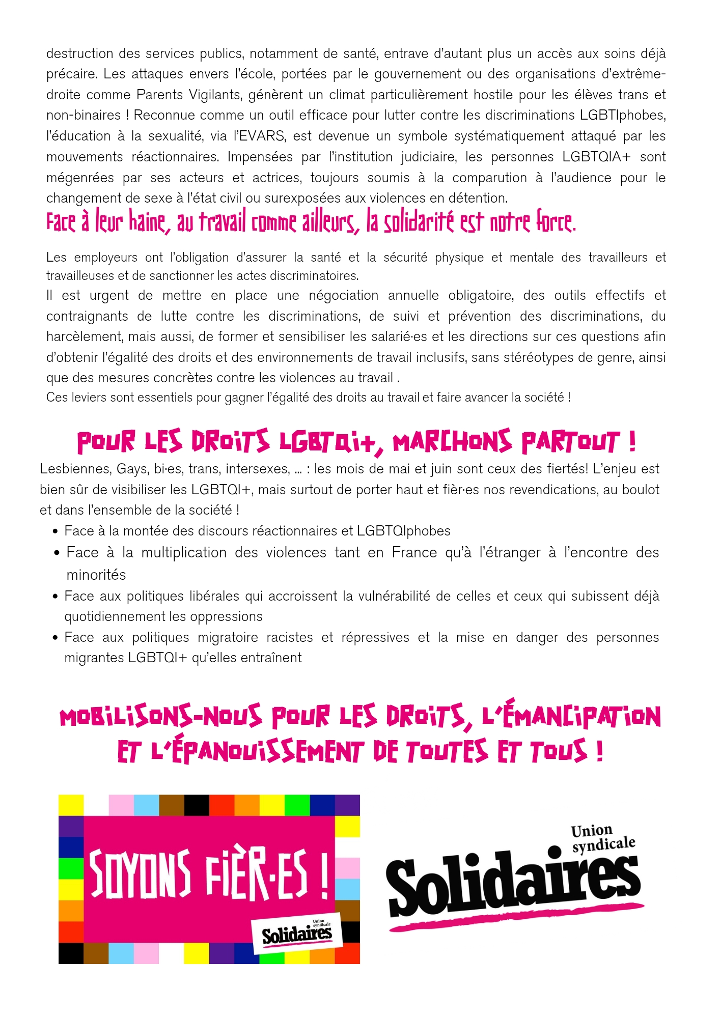Lesbiennes, Gays, bi·es, trans, intersexes, ... : les mois de mai et juin sont ceux des fiertés! L’enjeu est bien sûr de visibiliser les LGBTQI+, mais surtout de porter haut et fièr·es nos revendications, au boulot et dans l’ensemble de la société !