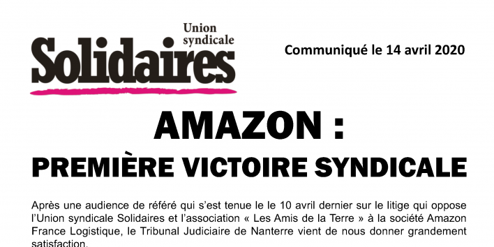 Après une audience de référé qui s’est tenue le le 10 avril dernier sur le litige qui oppose l’Union syndicale Solidaires et l’association « Les Amis de la Terre » à la société Amazon France Logistique, le Tribunal Judiciaire de Nanterre vient de nous donner grandement satisfaction.