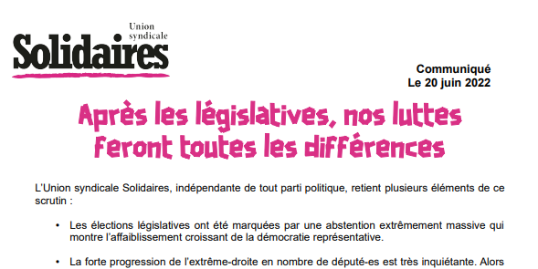 - Les urnes ont confirmé l'élection de deux ministres accusés de violences sexuelles. Pour Solidaires, l’écoute réelle de la parole des femmes et la lutte contre les violences sexistes et sexuelles a encore un long chemin à faire. Le choix de maintenir de telles personnes au gouvernement marque là aussi le déni de cette lutte essentielle par le pouvoir macronien.