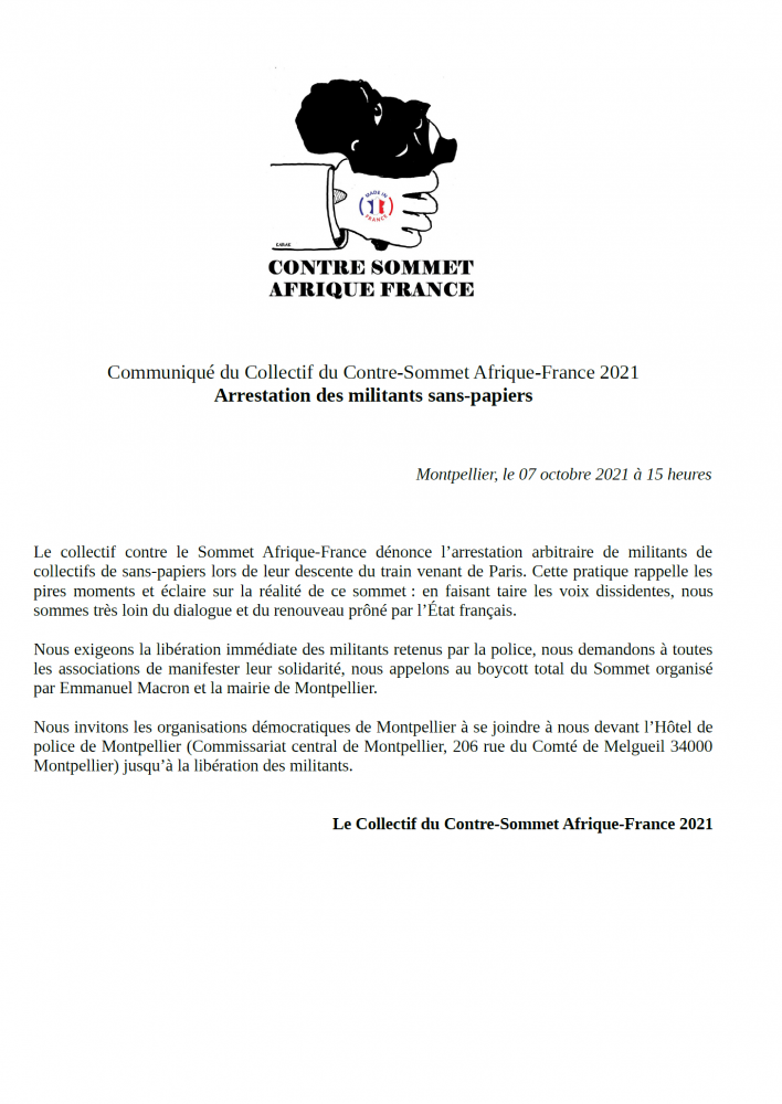 Le collectif contre le Sommet Afrique-France dénonce l’arrestation arbitraire de militants de collectifs de sans-papiers lors de leur descente du train venant de Paris.