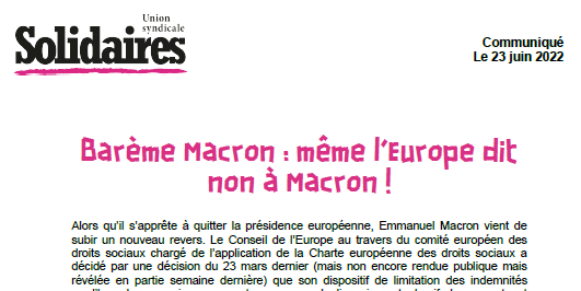 Alors qu’il s’apprête à quitter la présidence européenne, Emmanuel Macron vient de subir un nouveau revers. Le Conseil de l’Europe au travers du comité européen des droits sociaux chargé de l’application de la Charte européenne des droits sociaux a décidé par une décision du 23 mars dernier (mais non encore rendue publique mais révélée en partie semaine dernière) que son dispositif de limitation des indemnités prud’homales que risque un patron en cas de licenciement abusif de sa part est contraire aux engagements internationaux de la France. A l’instar de la Finlande et de l’Italie, le barème macronien est donc jugé contraire aux dispositions de la charte sociale car ne permettant pas une compensation adéquate du préjudice subi et par voie de conséquence, il lui est recommandé d’y mettre fin. Même si cette décision n’est pas une surprise et n’a aucun caractère contraignant, elle vient souligner en creux à quel point les droits sociaux français sont mal en point et que Macron en est en bonne partie responsable.