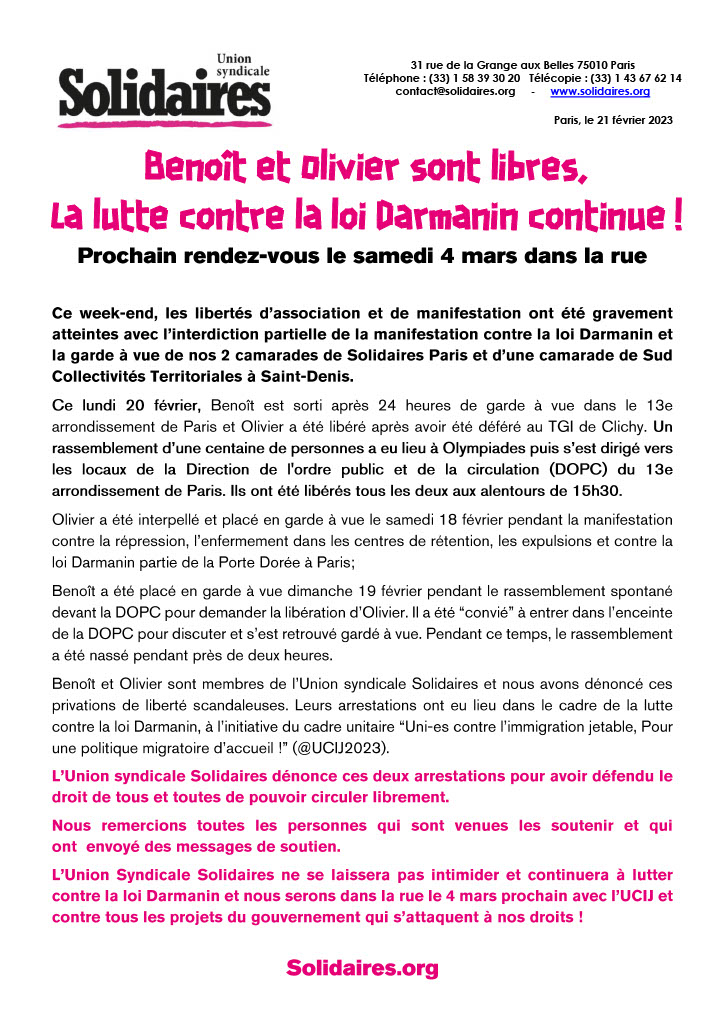 Benoît et Olivier sont membres de l’Union syndicale Solidaires et nous avons dénoncé ces privations de liberté scandaleuses. Leurs arrestations ont eu lieu dans le cadre de la lutte contre la loi Darmanin, à l’initiative du cadre unitaire “Uni-es contre l’immigration jetable, Pour une politique migratoire d’accueil !” (@UCIJ2023).