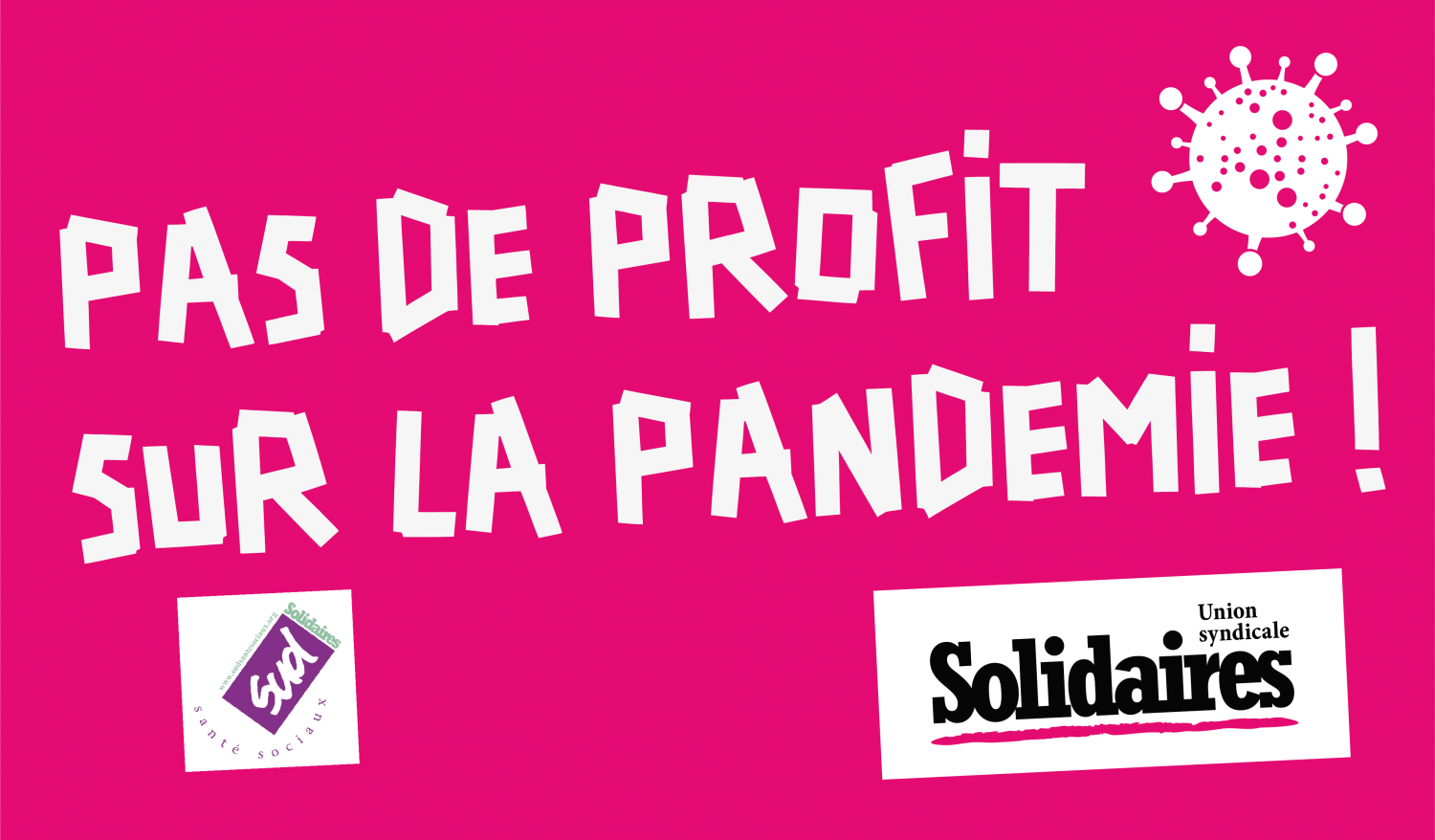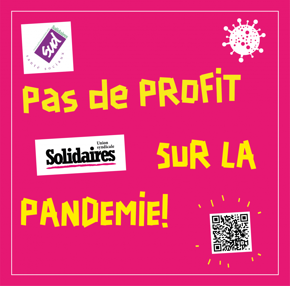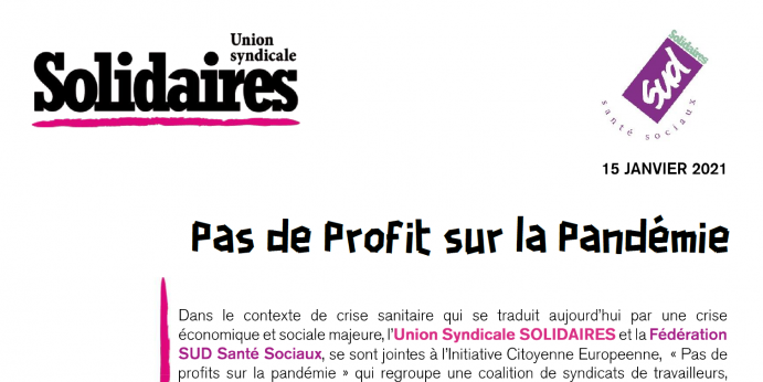 Dans le contexte de crise sanitaire qui se traduit aujourd’hui par une crise économique et sociale majeure, l’Union Syndicale SOLIDAIRES et la Fédération SUD Santé Sociaux, se sont jointes à l’Initiative Citoyenne Europeenne, « Pas de profits sur la pandémie » qui regroupe une coalition de syndicats de travailleurs, d'ONG, de groupes de militant.e.s, d'associations, de partis politiques et d'experts de la santé en France et en Europe.