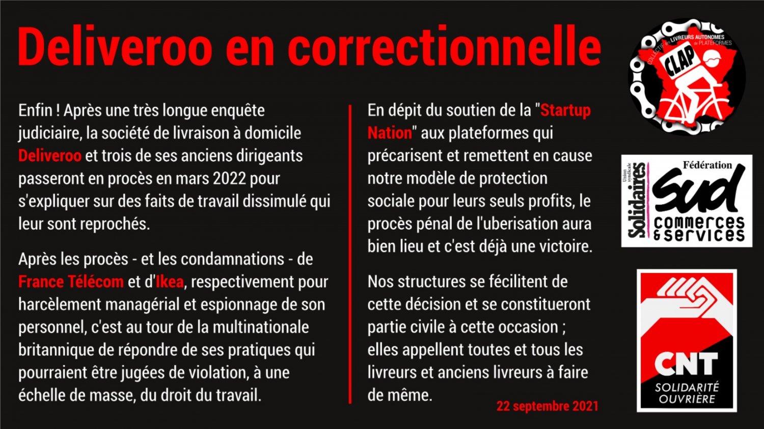 communiqué commun suite au procés à venir de Deliveroo pour travail dissimulé