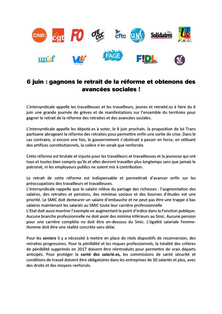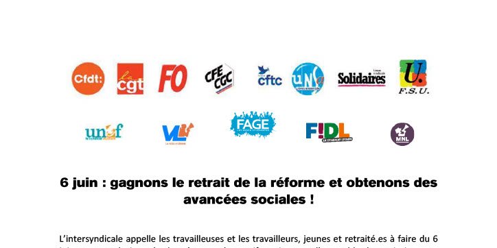 L’intersyndicale appelle les travailleuses et les travailleurs, jeunes et retraité.es à faire du 6 juin une grande journée de grèves et de manifestations sur l’ensemble du territoire pour gagner le retrait de la réforme des retraites et des avancées sociales.