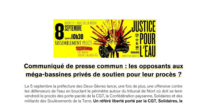 Communiqué de presse commun du 6 sept 2023: les opposants aux méga-bassines privés de soutien pour leur procès ?