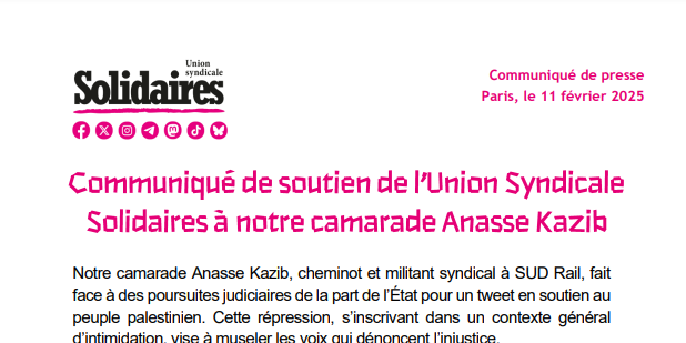 Notre camarade Anasse Kazib, cheminot et militant syndical à SUD Rail, fait face à des poursuites judiciaires de la part de l’État pour un tweet en soutien au peuple palestinien. Cette répression, s’inscrivant dans un contexte général d’intimidation, vise à museler les voix qui dénoncent l’injustice.
