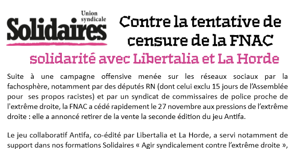 Le jeu collaboratif Antifa, co-édité par Libertalia et La Horde, a servi notamment de support dans nos formations Solidaires « Agir syndicalement contre l’extrême droite », et nous le revendiquons. Le jeu précise dans son préambule « Propos racistes, manifs homophobes, violences fascistes, ça suffit : contre l’extrême droite, à vous de jouer ! ».
