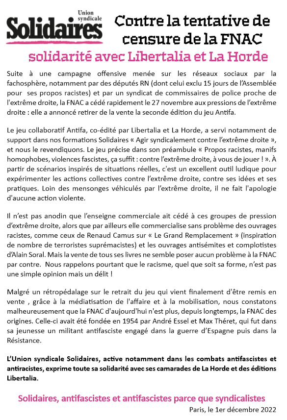 L’Union syndicale Solidaires, active notamment dans les combats antifascistes et antiracistes, exprime toute sa solidarité avec ses camarades de La Horde et des éditions Libertalia.