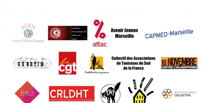 Arts et Cultures Engagés du Monde (ACEM) ; Association Démocratique des Tunisiens en France (ADTF) ; ATTAC ; Avenir Jeunes Marseille ; Cap-Med-Marseille ; Centre d’Etudes et d’Initiatives de Solidarité Internationale (CEDETIM) ; CGT ; Collectif des Associations de Tunisiens du Sud de la France - ATSF ; Collectif du 10 novembre contre l’islamophobie ; Collectif National pour les Droits des Femmes ; Comité pour le Respect des Libertés et des Droits de l’Homme en Tunisie (CRLDHT) ; Confédération Nationale du Travail (CNT) ; Confédération Paysanne ; DAL (Droit Au Logement) ; Emancipation Collective ; Europe solidaire sans frontières (ESSF) ; FASTI (Fédération des Associations de Solidarité avec Tou-te-s les Immigré-e-s) ; Fédération des Tunisiens pour une Citoyenneté des deux Rives (FTCR) ; FIDL ; Fondation Copernic ; Front Uni des Immigrations et des Quartiers Populaires (FUIQP) ; Immigration Développement Démocratie (IDD) ; Planning familial ; Syndicat des Avocats de France ; UNEF ; UNL ; Union des Tunisiens pour l’Action Citoyenne (UTAC) ; Union syndicale Solidaires.