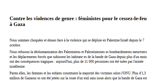 Nous opposons notre solidarité féministe et internationaliste à cette violence coloniale qui, les experts internationaux le disent depuis la mi-octobre, risque de se révéler génocidaire et refusons dans le cadre de cette solidarité toute forme d’instrumentalisation : nous combattons pied à pied l’antisémitisme et l’islamophobie et toutes les formes de racisme.