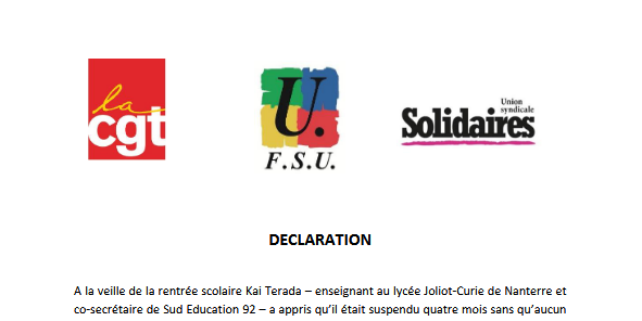 A la veille de la rentrée scolaire Kai Terada – enseignant au lycée Joliot-Curie de Nanterre et co-secrétaire de Sud Education 92 – a appris qu’il était suspendu quatre mois sans qu’aucun motif ne lui soit notifié. Le 22 septembre, reçu par le rectorat de l’Académie de Versailles, il apprend qu’il fait l’objet d’une « mutation dans l’intérêt du service » dans un autre département. Aucune faute professionnelle ne lui est reprochée.