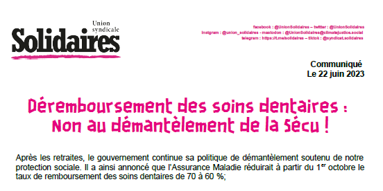 Après les retraites, le gouvernement continue sa politique de démantèlement soutenu de notre protection sociale. Il a ainsi annoncé que l’Assurance Maladie réduirait à partir du 1er octobre le taux de remboursement des soins dentaires de 70 à 60 %.