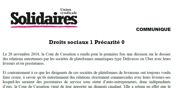 Le 28 novembre 2018, la Cour de Cassation a rendu pour la première fois une décision sur le dossier des relations entretenues par les sociétés de plateformes numériques type Deliveroo ou Uber avec leurs livreurs et/ou prestataires.