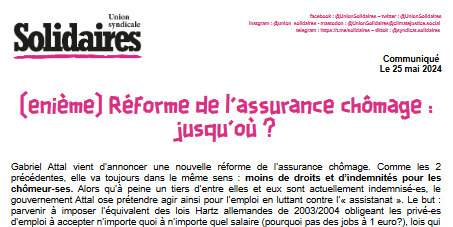 Gabriel Attal vient d’annoncer une nouvelle réforme de l’assurance chômage. Comme les 2 précédentes, elle va toujours dans le même sens : moins de droits et d’indemnités pour les chômeur-ses. Alors qu’à peine un tiers d’entre elles et eux sont actuellement indemnisé-es, le gouvernement Attal ose prétendre agir ainsi pour l’emploi en luttant contre l’« assistanat ». Le but : parvenir à imposer l’équivalent des lois Hartz allemandes de 2003/2004 obligeant les privé-es d’emploi à accepter n’importe quoi à n’importe quel salaire (pourquoi pas des jobs à 1 euro?), lois qui ont conduit à une explosion de la précarité et de la misère outre rhin, comme ce qui s'est également passé en Angleterre.