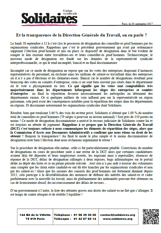 Et la transparence de la Direction Générale du Travail, on en parle ?