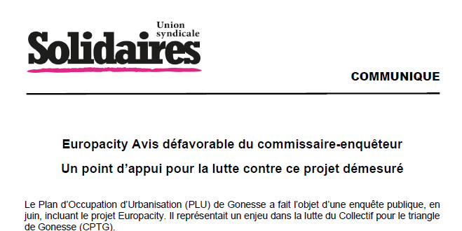 Europacity : Avis défavorable du commissaire-enquêteur - Un point d’appui pour la lutte contre ce projet démesuré
