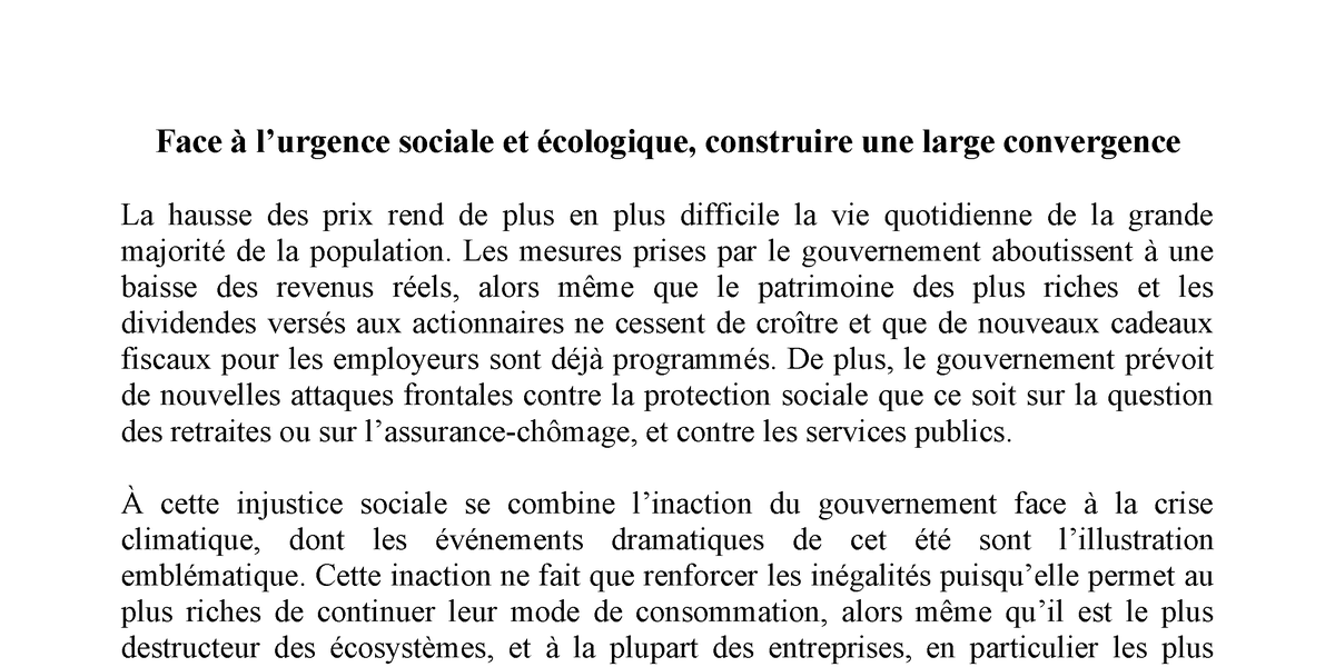 Dans cette situation, nos organisations syndicales, associations et forces politiques ont décidé d’entamer des échanges afin de construire ensemble un processus de mobilisation populaire pour mettre en échec la politique sociale et climatique menée par le gouvernement et pour imposer les changements nécessaires. Dans ce cadre, nous nous associons d’abord aux mobilisations syndicales déjà prévues les 22 et 29 septembre et à toutes celles qui vont avoir lieu dans les secteurs professionnels et les territoires. Et nous nous reverrons le 12 septembre pour décider ensemble d’éventuelles initiatives communes.