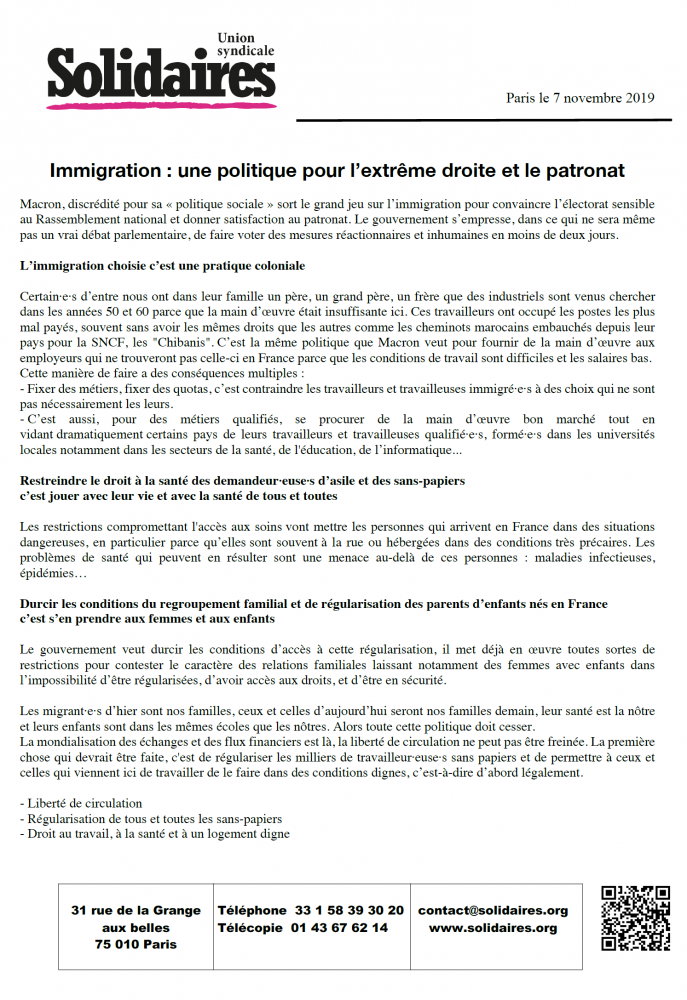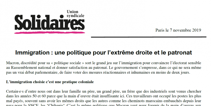 Certain·e·s d’entre nous ont dans leur famille un père, un grand père, un frère que des industriels sont venus chercher dans les années 50 et 60 parce que la main d’œuvre était insuffisante ici. Ces travailleurs ont occupé les postes les plus mal payés, souvent sans avoir les mêmes droits que les autres comme les cheminots marocains embauchés depuis leur pays pour la SNCF, les "Chibanis". C’est la même politique que Macron veut pour fournir de la main d’œuvre aux employeurs qui ne trouveront pas celle-ci en France parce que les conditions de travail sont difficiles et les salaires bas.