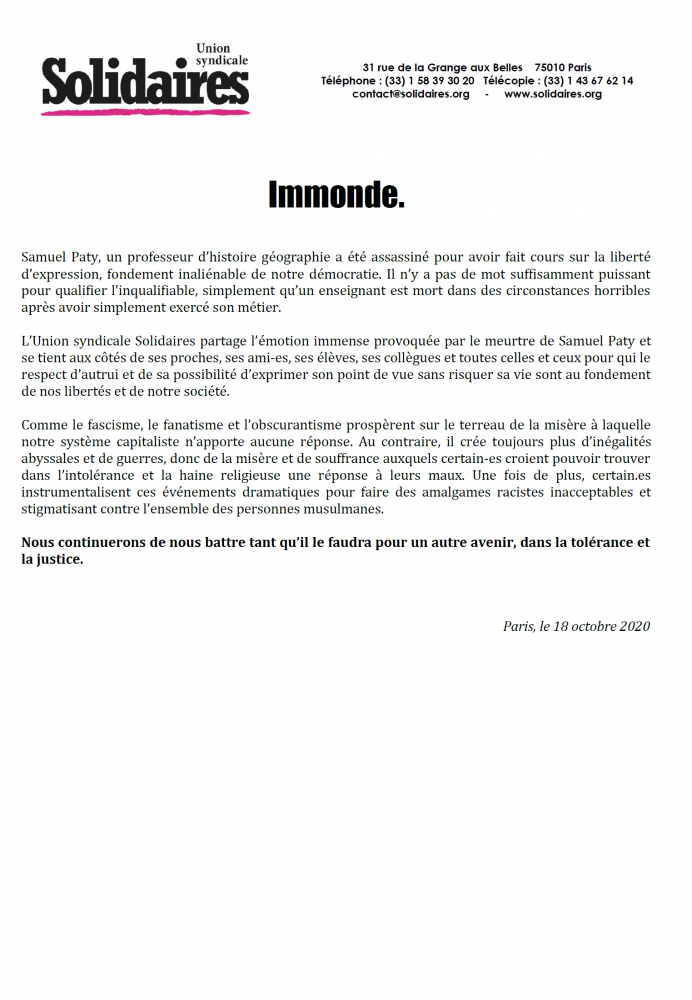 L’Union syndicale Solidaires partage l’émotion immense provoquée par le meurtre de Samuel Paty et se tient aux côtés de ses proches, ses ami-es, ses élèves, ses collègues et toutes celles et ceux pour qui le respect d’autrui et de sa possibilité d’exprimer son point de vue sans risquer sa vie sont au fondement de nos libertés et de notre société.