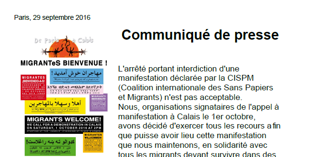 Interdiction de la manifestation à Calais le 1er octobre