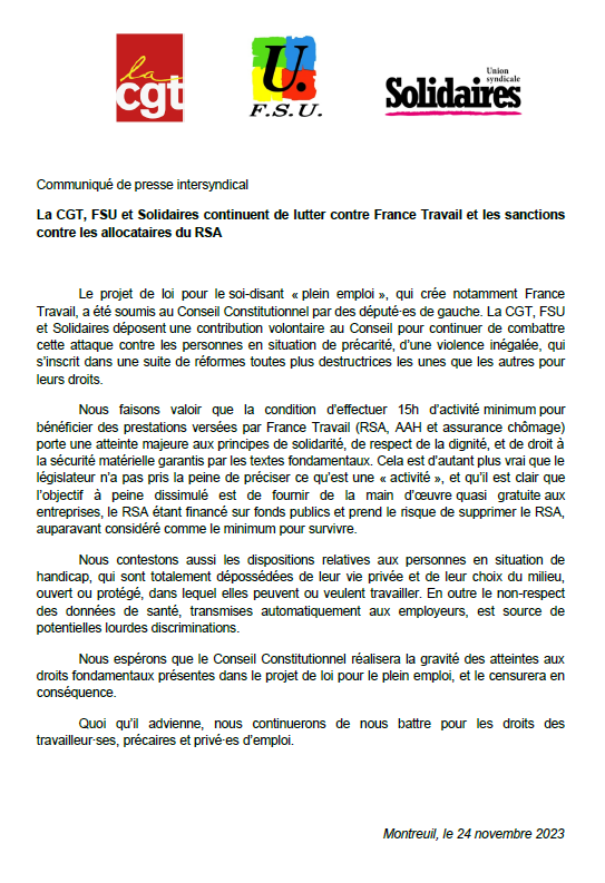 Le projet de loi pour le soi-disant « plein emploi », qui crée notamment France Travail, a été soumis au Conseil Constitutionnel par des député∙es de gauche. La CGT, FSU et Solidaires déposent une contribution volontaire au Conseil pour continuer de combattre cette attaque contre les personnes en situation de précarité, d’une violence inégalée, qui s’inscrit dans une suite de réformes toutes plus destructrices les unes que les autres pour leurs droits.