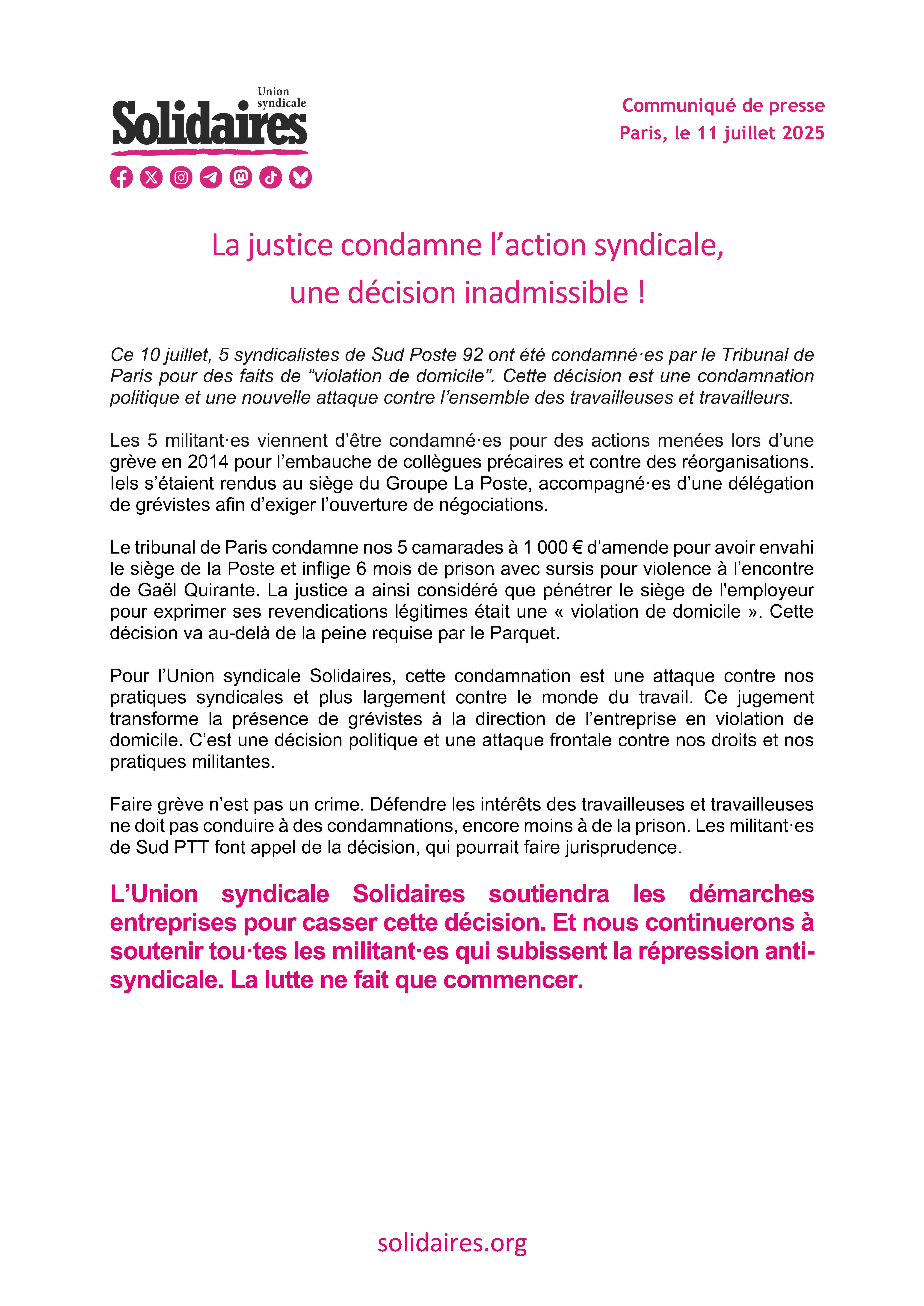Pour l’Union syndicale Solidaires, cette condamnation est une attaque contre nos pratiques syndicales et plus largement contre le monde du travail. Ce jugement transforme la présence de grévistes à la direction de l’entreprise en violation de domicile. C’est une décision politique et une attaque frontale contre nos droits et nos pratiques militantes.