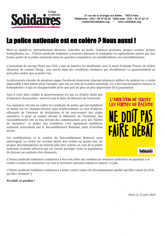 Mort-es, mutilé-es, interpellations abusives, contrôles au faciès, violences gratuites, propos racistes, propos homophobes, etc… l’Union syndicale Solidaires a toujours dénoncé et condamné ces agissements opérés par une bonne partie de la police nationale dans les quartiers populaires, les manifestations, les rassemblements.