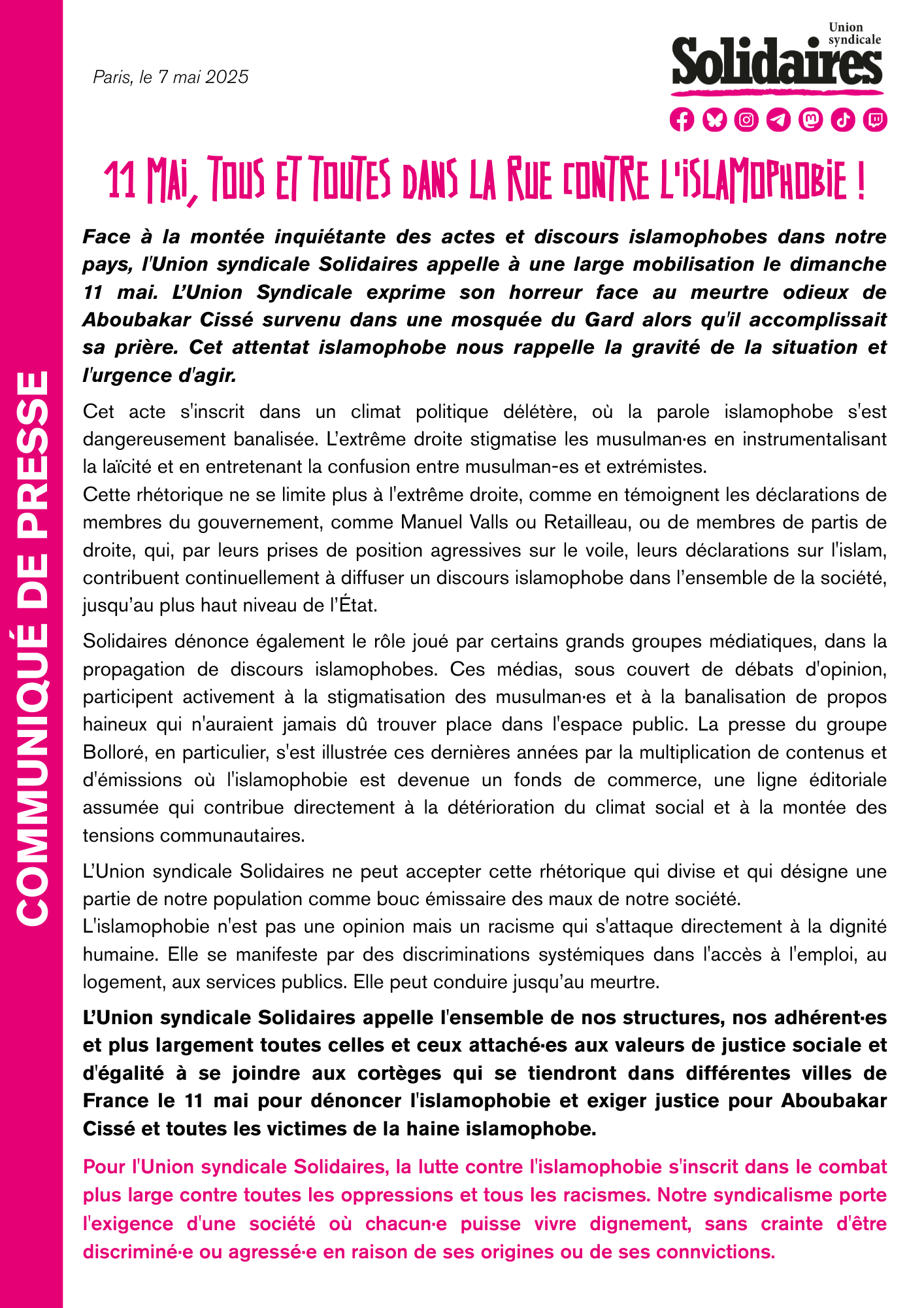 L’Union syndicale Solidaires appelle l'ensemble de nos structures, nos adhérent·es et plus largement toutes celles et ceux attaché·es aux valeurs de justice sociale et d'égalité à se joindre aux cortèges qui se tiendront dans différentes villes de France le 11 mai pour dénoncer l'islamophobie et exiger justice pour Aboubakar Cissé et toutes les victimes de la haine islamophobe.