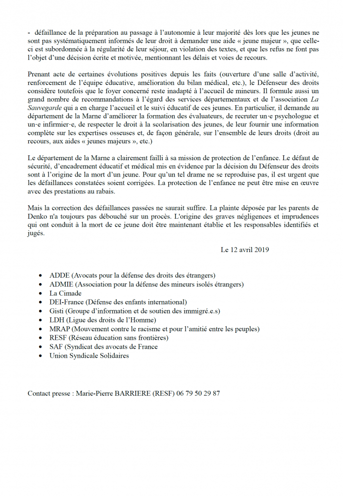 Le cadre inter-associatif & syndicale continue à exiger l'ouverture d'une enquête sur le décès de Denko afin que soit établies les responsabilités (cf. communiqué de RESF du 10 mai 2017)