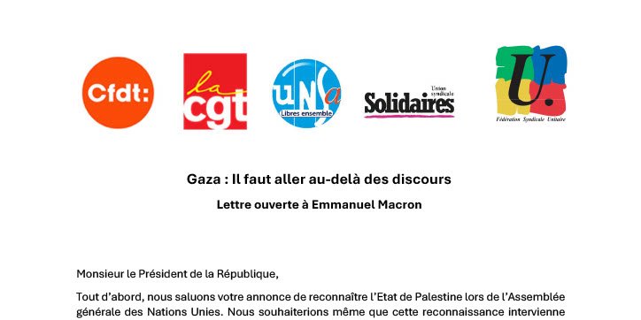 À l’occasion de la conférence ministérielle des Nations Unies sur la Palestine (28 et 29 juillet), plusieurs organisations syndicales ont adressé une lettre ouverte au président de la République, appelant la France à prendre des mesures concrètes à la hauteur de la gravité de la situation.