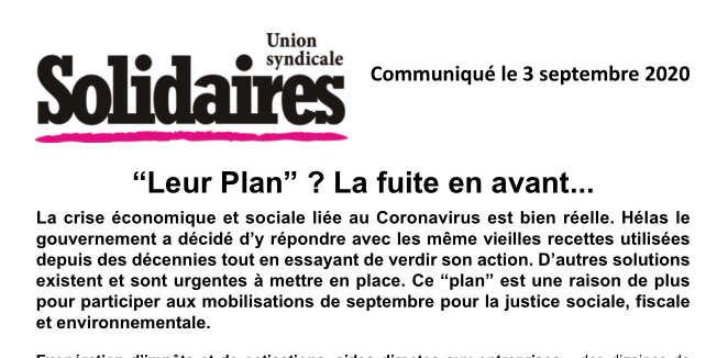 La crise économique et sociale liée au Coronavirus est bien réelle. Hélas le gouvernement a décidé d’y répondre avec les même vieilles recettes utilisées depuis des décennies tout en essayant de verdir son action. D’autres solutions existent et sont urgentes à mettre en place. Ce “plan” est une raison de plus pour participer aux mobilisations de septembre pour la justice sociale, fiscale et environnementale.