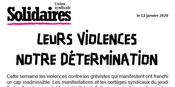 Cette semaine les violences contre les grévistes qui manifestent ont franchi un cap inadmissible. Les manifestations et les cortèges syndicaux du jeudi 9 et celles du samedi 11 ont été l'objet d'attaques volontaires et violentes sur l'ensemble du territoire de la part de la police. Des camarades ont été molesté-es ou tabassé-es, des cortèges ont reçu des tirs de LBD, de grenades de désencerclement et de lacrymogène. Des armes sont utilisées contre les grévistes. Les arrestations et garde-à-vues arbitraires et sans fondements se multiplient. On a vu également des interdictions à la dernière minute de manifestations pour cause de "premier samedi des soldes" et la répression physique des manifestant.es.