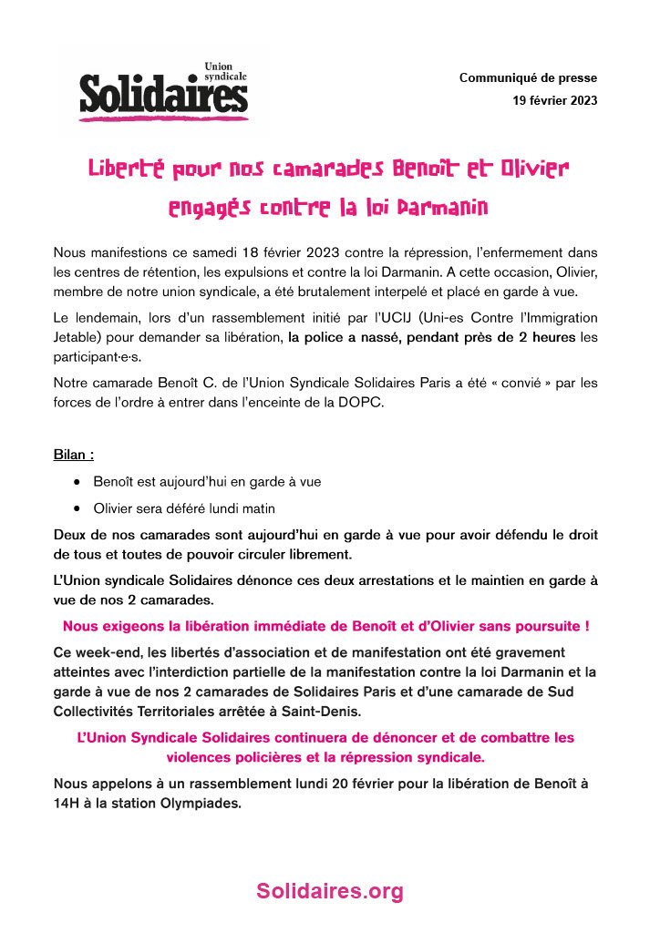 Nous manifestions ce samedi 18 février 2023 contre la répression, l’enfermement dans les centres de rétention, les expulsions et contre la loi Darmanin. A cette occasion, Olivier, membre de notre union syndicale, a été brutalement interpelé et placé en garde à vue.