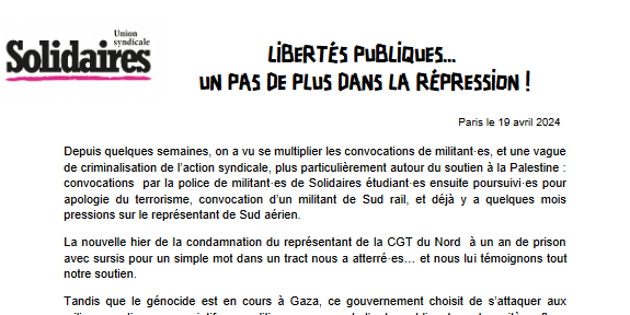 Depuis quelques semaines, on a vu se multiplier les convocations de militant·es, et une vague de criminalisation de l’action syndicale, plus particulièrement autour du soutien à la Palestine : convocations par la police de militant·es de Solidaires étudiant·es ensuite poursuivi·es pour apologie du terrorisme, convocation d’un militant de Sud rail, et déjà y a quelques mois pressions sur le représentant de Sud aérien.