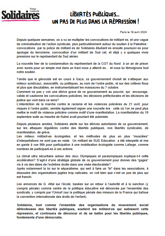 Solidaires, tout comme l’ensemble des organisations du mouvement social défendeuses des libertés publiques, soutient les militant·es qui subissent cette répression, et continuera de dénoncer et de se battre pour les libertés publiques, fondements d’une démocratie.