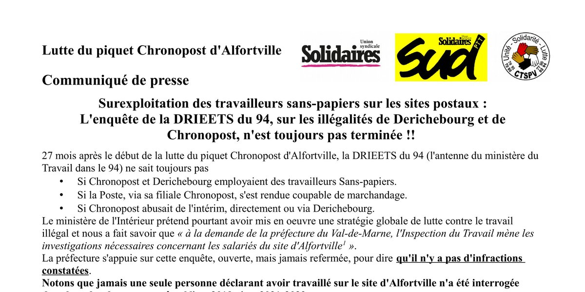 L'enquête de la DRIEETS du 94, sur les illégalités de Derichebourg et de Chronopost, n'est toujours pas terminée !!