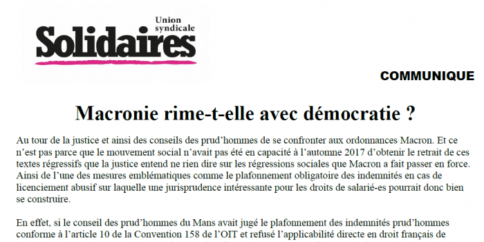 Au tour de la justice et ainsi des conseils des prud’hommes de se confronter aux ordonnances Macron. Et ce n’est pas parce que le mouvement social n’avait pas été en capacité à l’automne 2017 d’obtenir le retrait de ces textes régressifs que la justice entend ne rien dire sur les régressions sociales que Macron a fait passer en force.